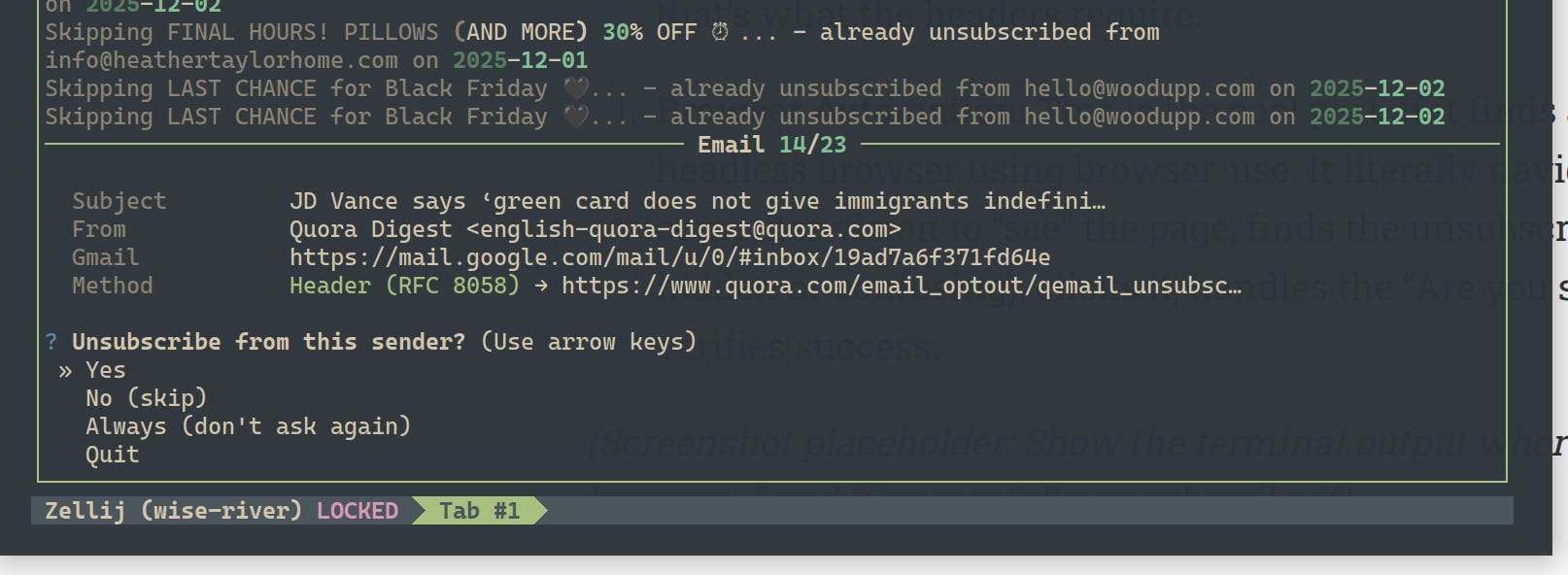 Browser Automation: This is the cool part. If it finds a link, it spins up a headless browser using browser-use. It literally navigates to the page, uses computer vision to “see” the page, finds the unsubscribe button (even if it’s hidden or confusing), clicks it, handles the “Are you sure?” prompts, and verifies success.