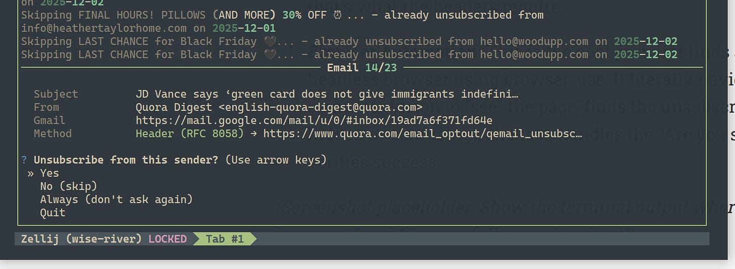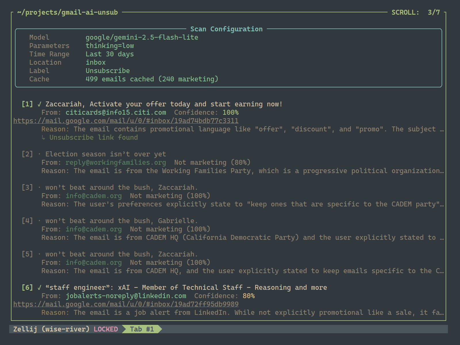 > gmail-ai-unsub unsubscribeThe tool looks at everything in that Unsubscribe label and goes to work on multiple fronts: